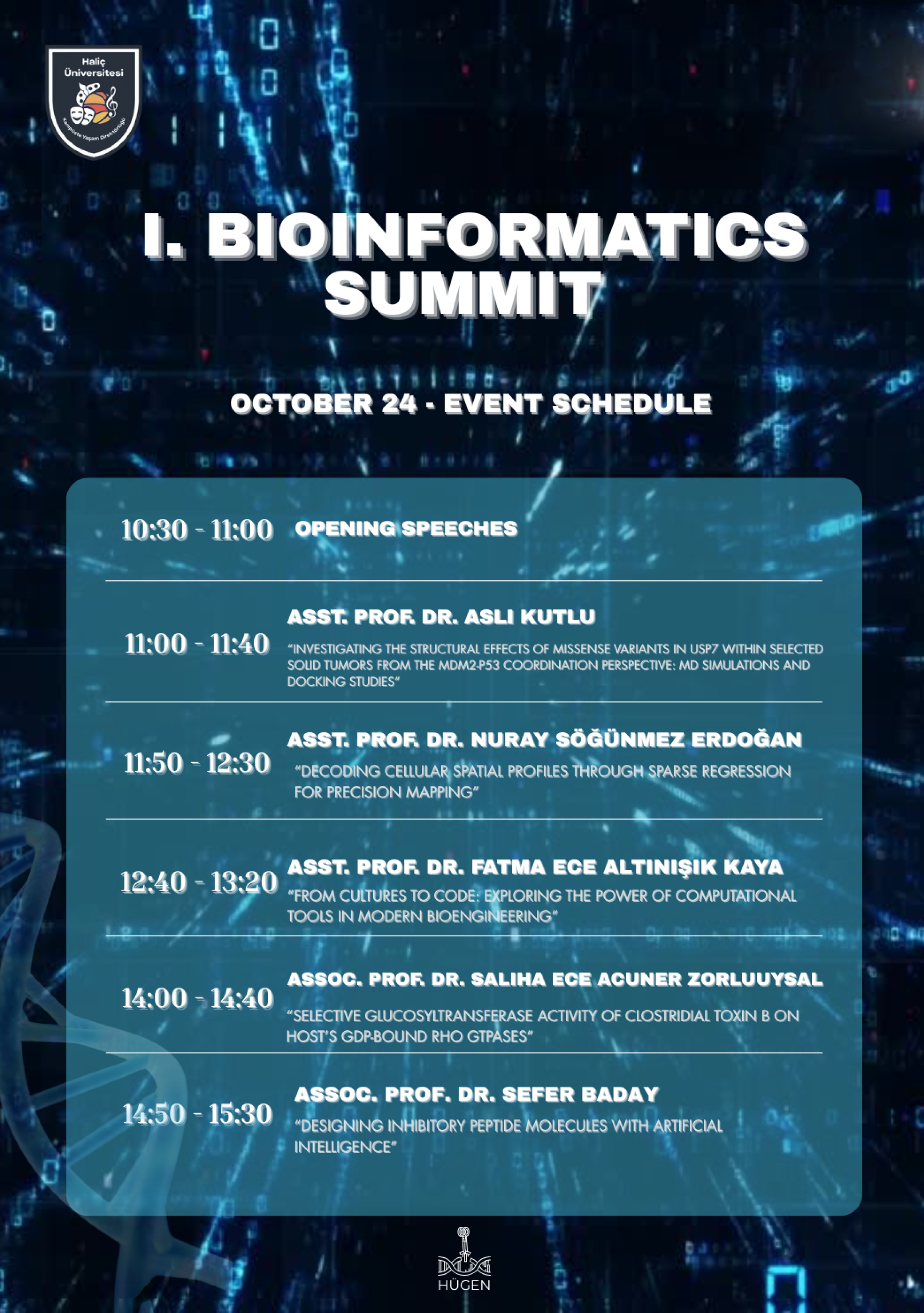 Haliç Üniversitesi Genetik Topluluğu (HÜGEN) tarafından 24 Ekim 2025 tarihinde düzenlenecek olan "I. Bioinformatics Summit" etkinliği; çeşitli üniversitelerden Genetik, Veri Bilimi ve Biyoteknoloji alanlarında öncü akademisyenlerin katılımıyla gerçekleştirilecektir.