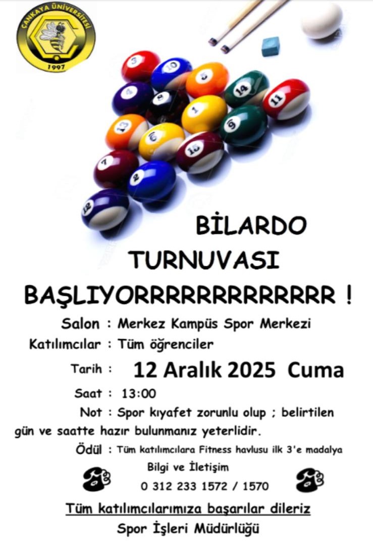 Güz Dönemi Okul içi bilardo turnuvası 12 Aralık Cuma Günü Saat 13:00'da merkez kampüs Spor Merkezinde gerçekleşecektir. Turnuvaya katılmak isteyen tüm öğencilerimizin belirtilen gün ve saatte spor kıyafetleri ile Spor Merkezinde bulunmaları rica olunur.