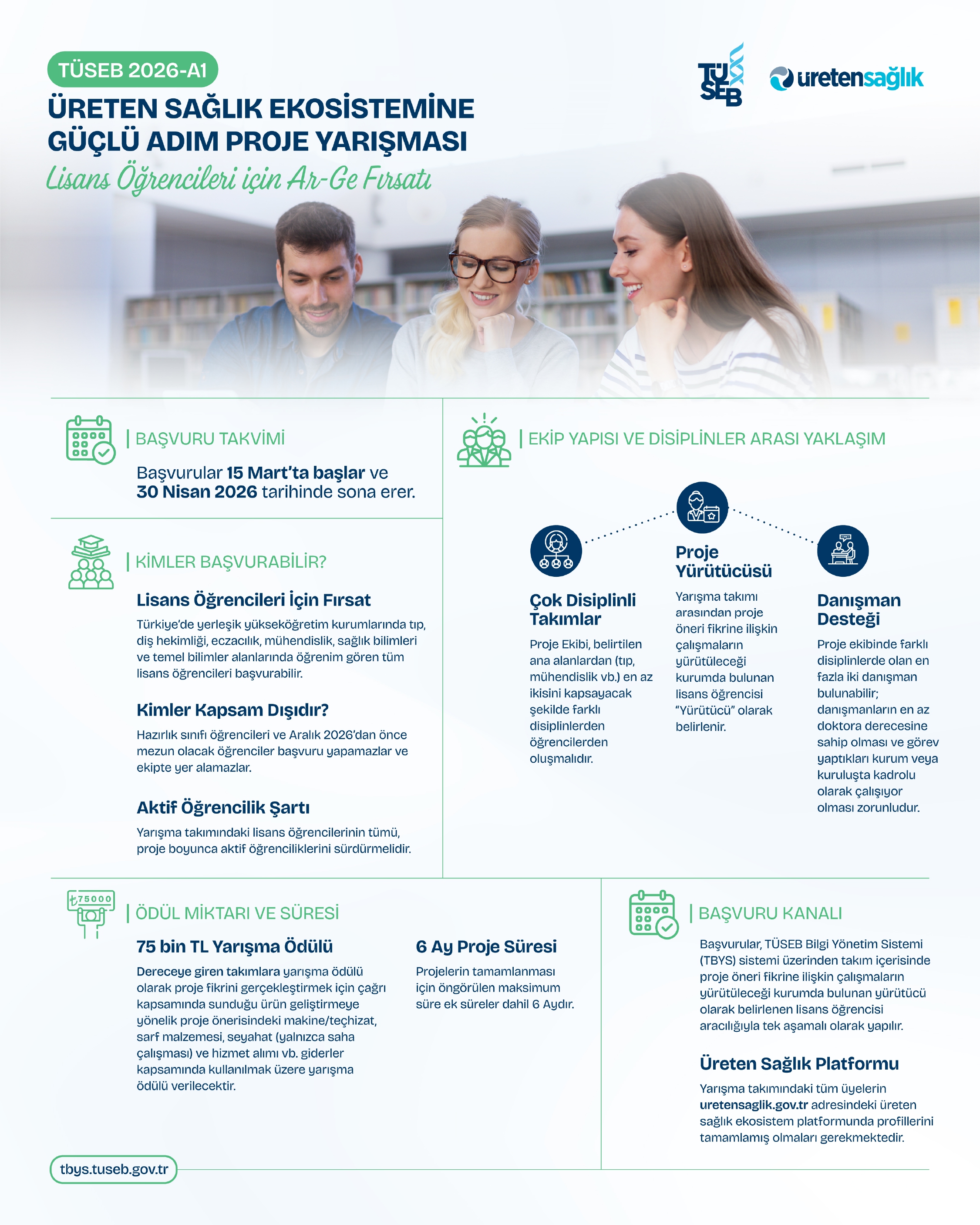 Türkiye Sağlık Enstitüleri Başkanlığı (TÜSEB) tarafından lisans öğrencilerine yönelik olarak düzenlenen A1 Lisans Proje Yarışması başvuru çağrısı açılmıştır. Program kapsamında öğrencilerin sağlık alanında yenilikçi proje fikirleri geliştirmeleri ve üreten sağlık ekosistemine katkı sağlamaları amaçlanmaktadır.
