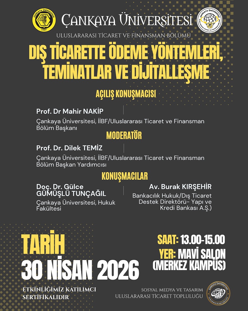 Üniversitemiz Uluslararası Ticaret ve Finansman Bölümü tarafından 30 Nisan 2026 tarihinde, 13:00-15:00 saatleri arasında Mavi Salon’da “Dış Ticarette Ödeme Yöntemleri, Teminatlar ve Dijitalleşme” konulu bir panel düzenlenecektir.